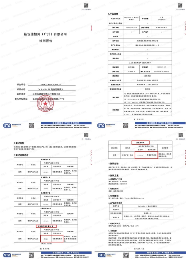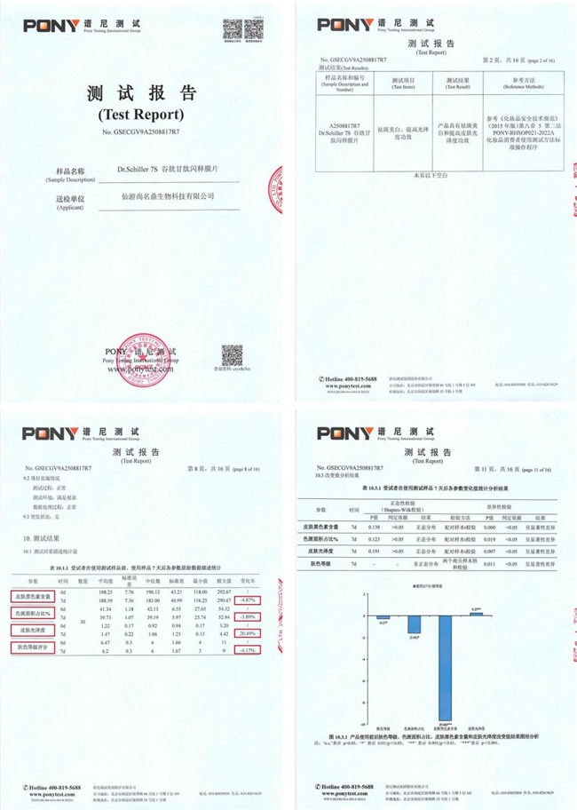 Dr.Schiller 5S闪释小白片使用者每日早晚各服用1片,坚持7天后,脸颊部位的黑色素含量降低5.54%,肌肤光泽度则是提升37.96%(数据来源:Standard Testing Group Co., Ltd.关于Dr.Schiller 5S 谷胱甘肽闪释膜片的人体功效实测报告,报告编号:STDGZ-H240426002N;经实验室测试显示,在特定使用条件下,部分使用者反馈肤色有所改善,具体效果因人而异)。Dr.Schiller 7S闪释小白片:使用者在同样的使用方式与周期下,7天内黑色素减少4.87%,色斑面积缩小3.89%,光泽度也提升了20.49% (数据来源:Pony Testing International Group关于Dr.Schiller 7S 谷胱甘肽闪释膜片的人体功效实测报告,报告编号:No.GSECGV9A2508817R7;经实验室测试显示,在特定使用条件下,部分使用者反馈肤色有所改善,具体效果因人而异)。