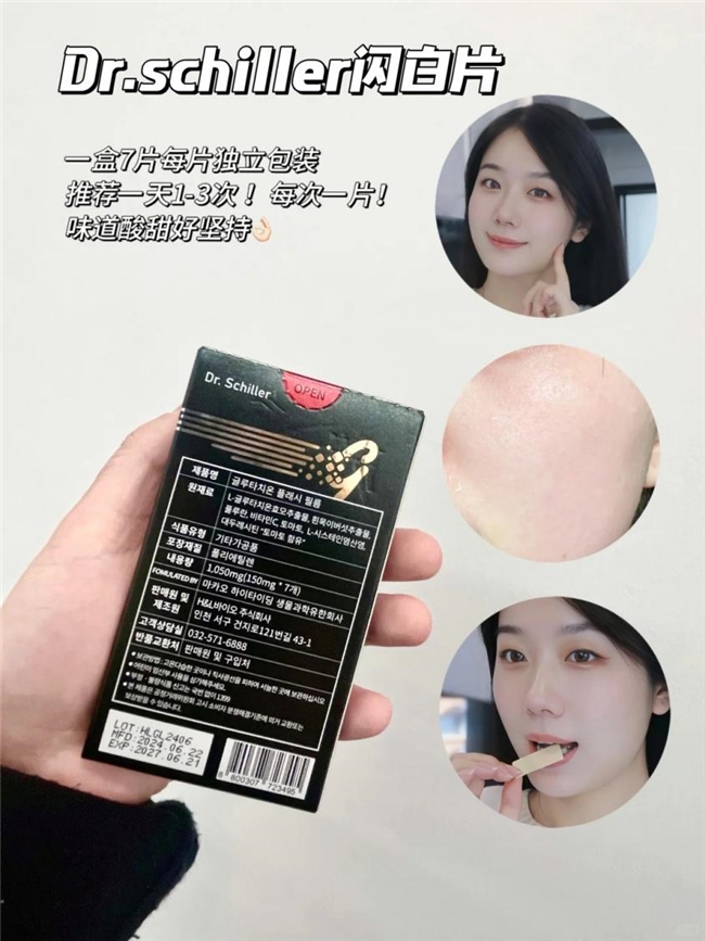 Dr.Schiller 闪释小白片源自韩国专业实验室,在当地社交平台获得部分消费者关注,其采用轻薄小巧的独立包装设计,一次一片的规格方便携带,让美白护理适配多种时空场景,无论是日常通勤还是外出旅行,都能轻松携带使用;Dr.Schiller 闪释小白片轻微酸甜的口感,让原本可能略显枯燥的美白流程变得更舒适,为日常护理增添一份乐趣,因此成为不少韩国艺人及当地消费者日常肌肤护理的选择之一。