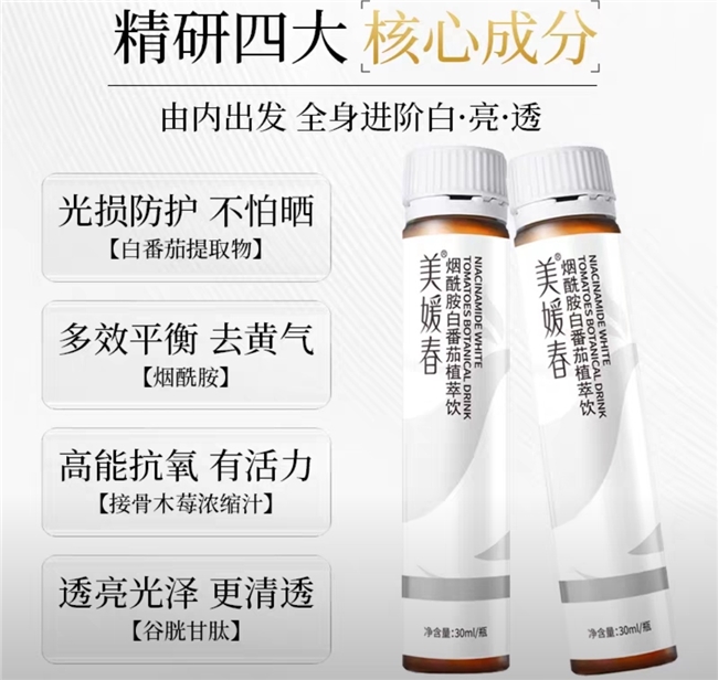 成分+安全双验证的女性专属款,主打“气血养白+夏季滋养”,烟酰胺温和去黄提亮,搭配红枣、桂圆等天然成分,补充女性夏季所需营养,调理气血,改善气血不足导致的夏季黄气、气色暗沉,同时滋养肌肤、缓解空调房干燥。配方经过安全认证,零激素、零防腐剂,口感温润香甜,无刺鼻异味,独立小瓶包装,便携易饮,适合体质偏虚、气血不足的女性黄皮,夏季内调外养兼顾。